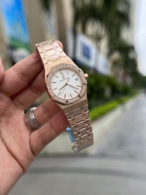 Timeless Elegance: The Audemars Piguet Royal Oak 34mm in Rose Gold with a White Dial is a luxurious statement piece that combines classic design with modern sophistication. Its rose gold construction and clean white dial create a striking contrast, making it a versatile choice for any occasion. Warranty: This exquisite timepiece comes with a manufacturer’s warranty, ensuring it is protected against any defects or malfunctions. Rest assured with your purchase, backed by the quality and expertise of Audemars Piguet.