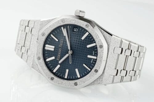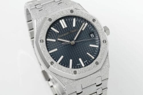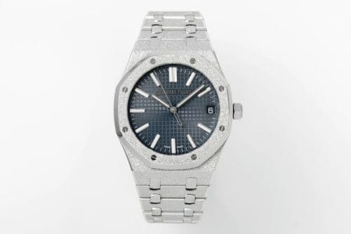 Iconic Styling: The APSF Royal Oak 15510 Super Clone boasts a frosted stainless steel case and bracelet, adorning a beautiful blue textured dial with distinct luminous white markers. This extraordinary timepiece is designed for those who enjoy a unique style with enchanting sophistication. Warranty: All our high-quality replica watches, come with a comprehensive 2-year warranty. This ensures your timepiece is protected against defects or malfunctions, providing peace of mind and confidence in your purchase.