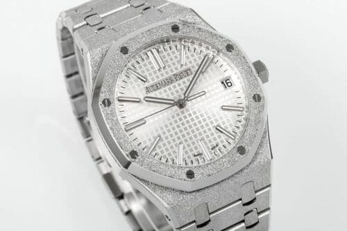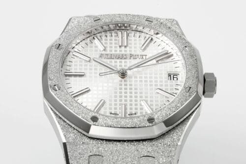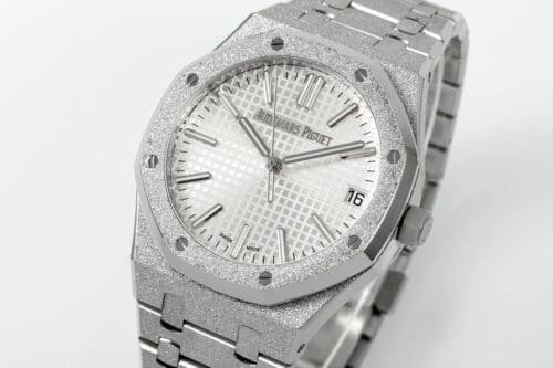 Iconic Styling: The Royal Oak 15510 features a striking frosted stainless steel case and bracelet with a unique white textured dial, providing a luxurious yet understated aesthetic. Warranty: All our high-quality replica watches come with a comprehensive 2-year warranty. This ensures your timepiece is protected against defects or malfunctions, providing peace of mind and confidence in your purchase.