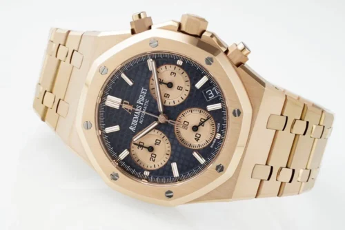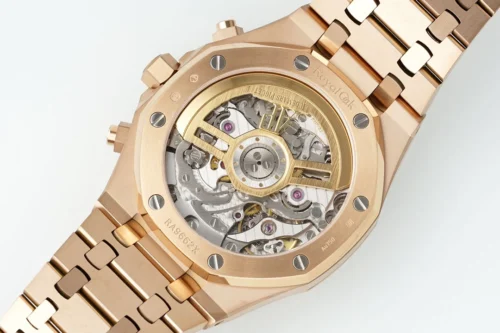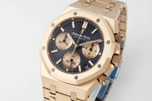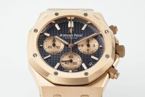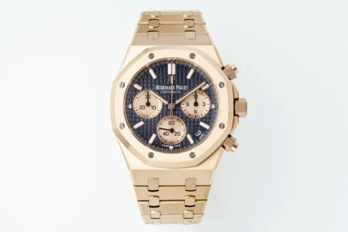 Authenticity: The Royal Oak Chronograph 26240 RG APSF Super Clone in rose gold is a top-tier replica, boasting a beautiful blue “Grande Tapisserie” dial with contrasting rose gold subdials. Paired with a solid rose gold integrated bracelet and high-precision SA4401 automatic chronograph movement, this piece exemplifies the perfect union of Royal Oak prestige and advanced replica craftsmanship. Warranty: All our Audemars Piguet super clone watches, including the Royal Oak Chronograph 26240 RG APSF, are covered by a comprehensive 2-year warranty against manufacturing defects, ensuring your confidence and peace of mind.
