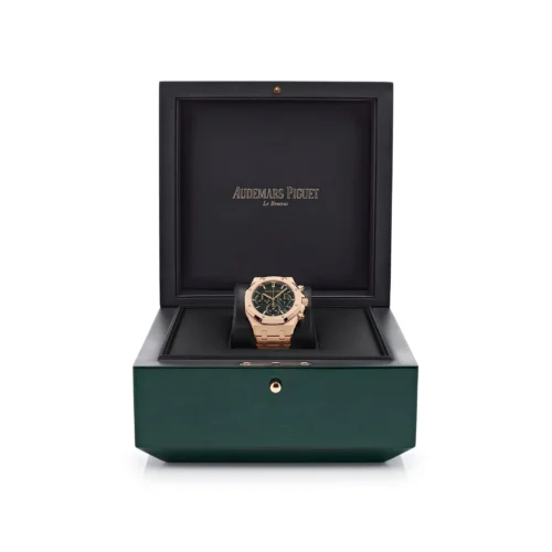 Authenticity: Celebrating half a century of excellence, the Audemars Piguet Royal Oak 26240OR.OO.1320OR.08 ’50th Anniversary’ Chronograph stands as a testament to unrivaled design and craftsmanship. This rose gold edition, accentuated by a striking khaki green dial, embodies both innovation and tradition. Warranty: This commemorative watch is secured by a comprehensive 2-year warranty, ensuring your exquisite timepiece is protected against any defects or malfunctions. Own a piece of history with this remarkable anniversary edition.