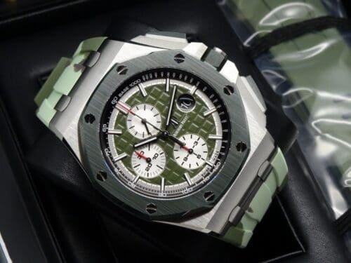 Authenticity: The Royal Oak Offshore 26400 44mm RSF 1:1 Best Edition is a high-quality replica that captures the essence of Audemars Piguet’s bold design and technical prowess. Featuring a notable green ceramic bezel, this model is paired with a military-style rubber strap, offering a unique blend of rugged aesthetics and luxury craftsmanship. Warranty: All our premium replica watches, including the Royal Oak Offshore 26400, come with a comprehensive 2-year warranty. This ensures your timepiece is safeguarded against any defects or malfunctions, providing peace of mind with your purchase.